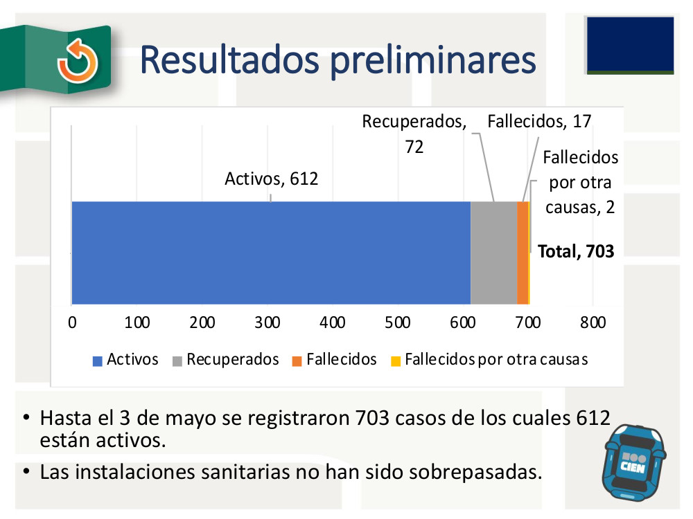 "Para el 3 de mayo teníamos 612 activos y 703 casos confirmados" muestra @jdcasasola "para el 4 de mayo eran 730 y 19 fallecidos. Afortunadamente, los datos muestran que estamos lejos del escenario del Imperial College, donde se esperaban hasta 5mil muertes."pic.twitter.com/g4gTvwopcY