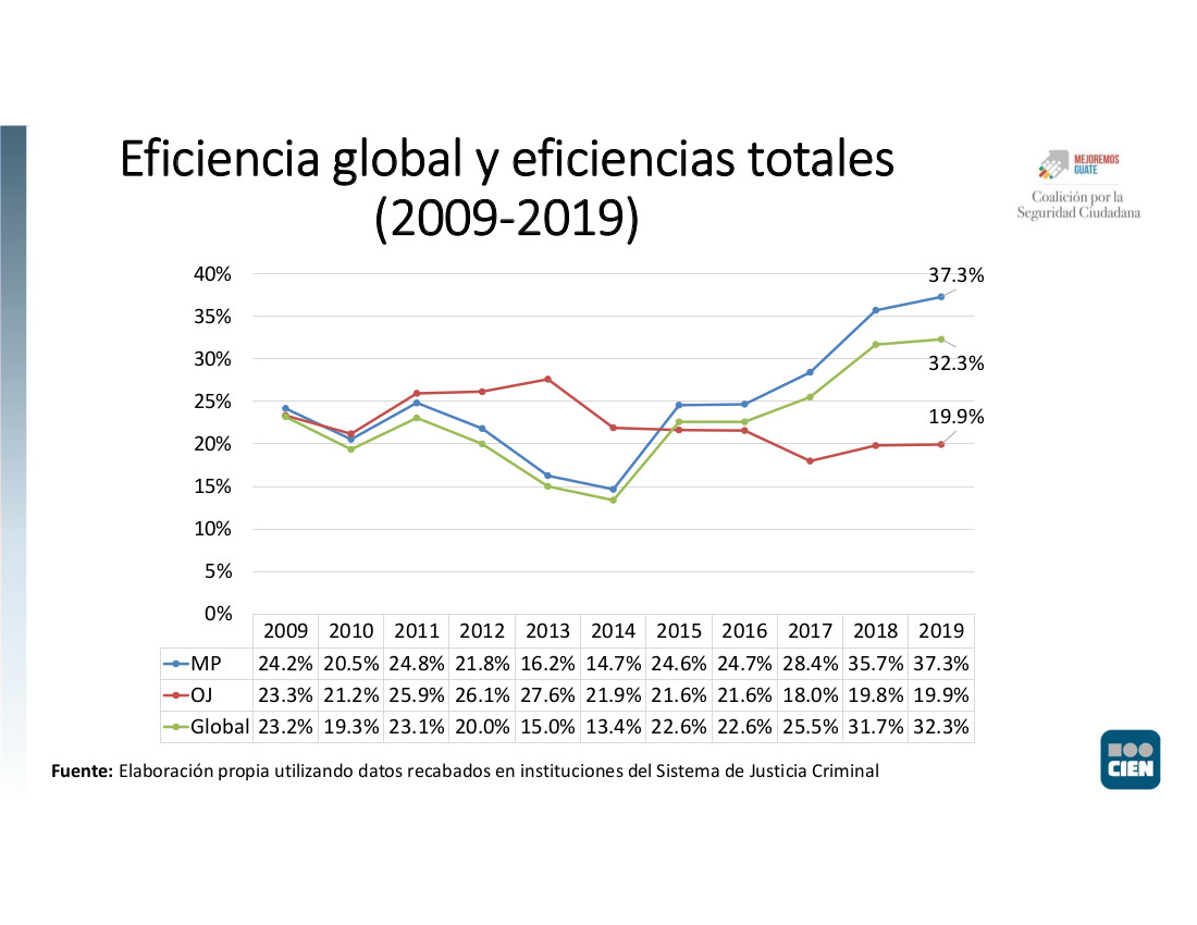 Esta gráfica muestra la eficiencia global, junto con las eficiencias individuales del @MPguatemala y el @OJGuatemala, las dos instituciones que dan salida a los casos e influyen en los resultados del Flujograma: