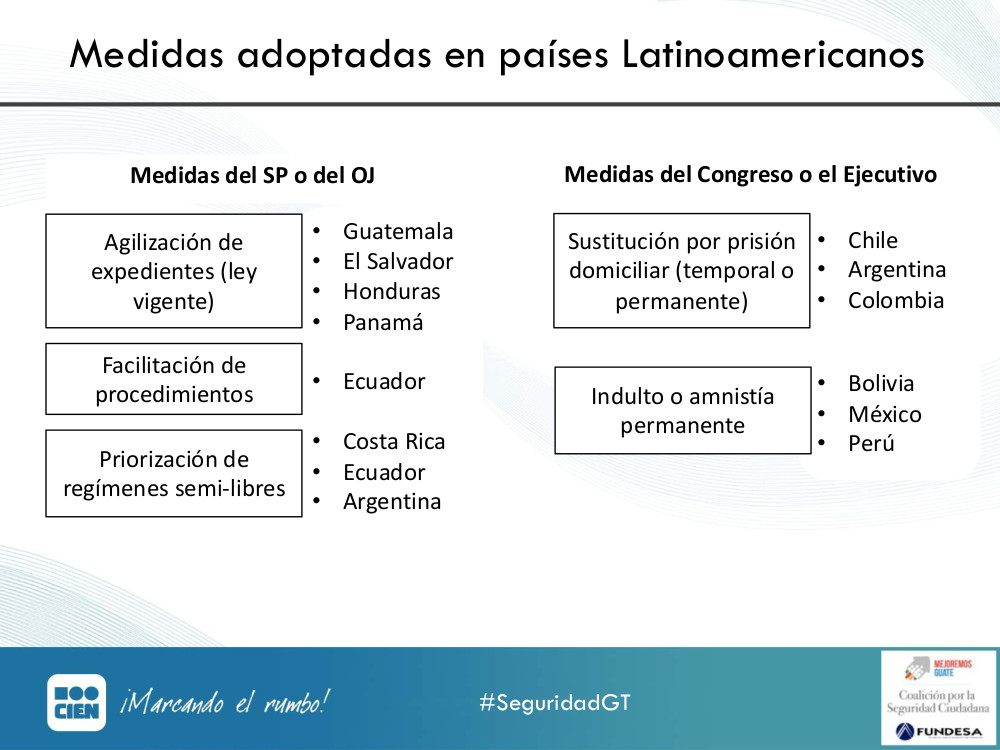 "A la izquierda podemos ver los países que han tomado medidas a través de sus Sistemas Penitenciarios u Organismos Judiciales y el otro grupo a la derecha, quienes han emitido disposiciones presidenciales o del Congreso" muestra @CorinneDedik en #SeguridadGTpic.twitter.com/kRtZ9TFdYa