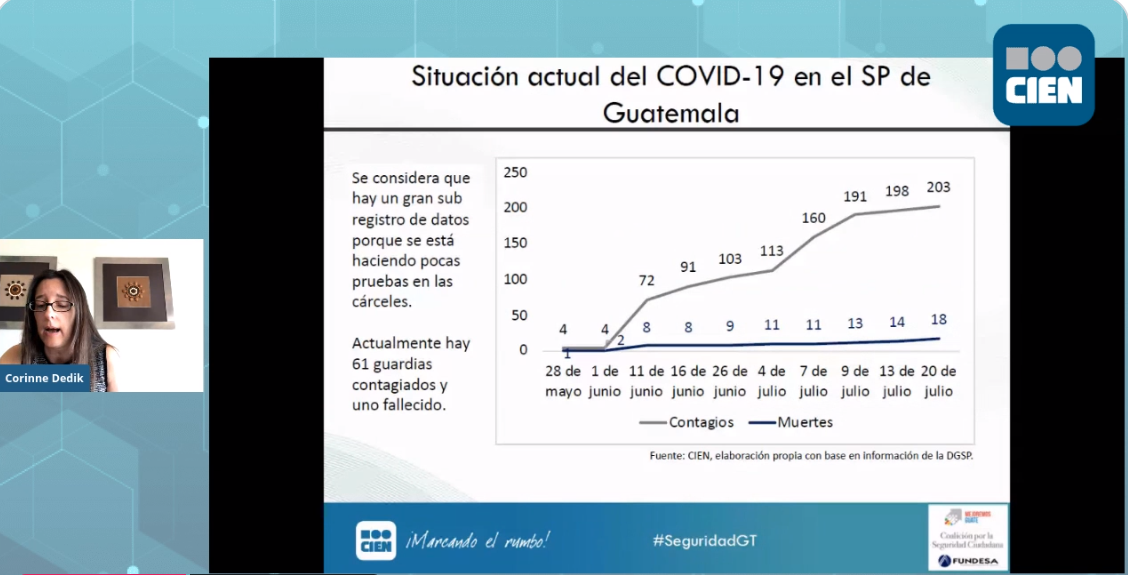 "En Guatemala, en el SP hay oficialmente al lunes, 203 reclusos contagiados por #COVID19 y 61 guardias penitenciarios, de los cuales desafortunadamente uno falleció" comenta @CorinneDedik en #SeguridadGT "pero no se han hecho pruebas masivas y probablemente haya subregistro."pic.twitter.com/3w7rUVDKQF