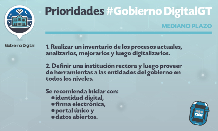 Para llegar al #DesarrolloGT debemos priorizar el Gobierno Digital en Guatemala. Compartimos nuestras recomendaciones en este tema. Por ejemplo, a mediano plazo se debe iniciar con: