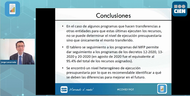 "Se trata de monitorear la ejecución de los programas para poder detectar cuellos de botella y así poder sugerir mejoras en los programas a futuro" concluye @jlavarre y comparte que el Observatorio realizará presentaciones periódicas para la ejecución de recursos de #COVID19GTpic.twitter.com/jKDSSqHYVg