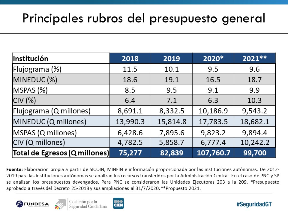 "Derivado del #COVID19, se hicieron ampliaciones presupuestarias por Q19,806.4 millones en 2020 y para 2021, se propone un Presupuesto de Q99,700 millones. Se puede observar que a pesar del incremento, la participación de las instituciones del Flujograma cayó a 9.5%" #SeguridadGTpic.twitter.com/xGAqmUqUPP