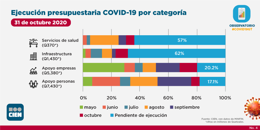 Al 31 de octubre 2020 según el Observatorio #COVID19GT, la categoría de Apoyo a personas mostraba un avance del 82.9% en ejecución presupuestaria, seguido de Apoyo a empresas con 79.8%. En Servicios de salud e Infraestructura aún falta más de la mitad de los fondos por ejecutar:pic.twitter.com/JUQ2piOBsK