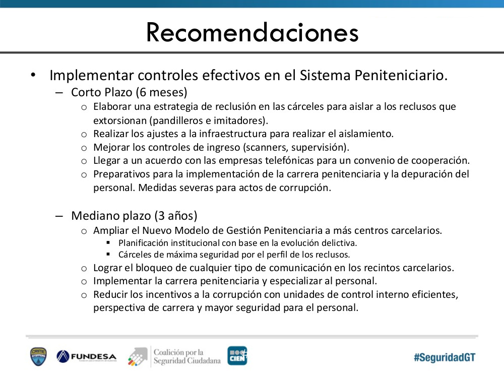 En los próximos 6 meses debe haber una estrategia de reclusión en las cárceles para aislar a pandilleros e imitadores que estén extorsionando. Luego en el mediano plazo, mejorar la infraestructura carcelaria y a largo plazo, invertir en nuevos espacios carcelarios: