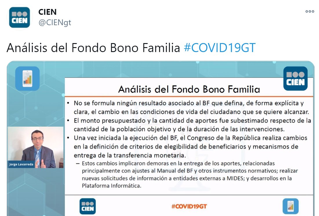"Que se hayan cambiado las reglas del juego del programa una vez ya había iniciado significó retos en su implementación y apoyo a los beneficiarios" opina @jlavarre sobre el Bono Familia #COVID19GT:pic.twitter.com/MlKpJDiD4m