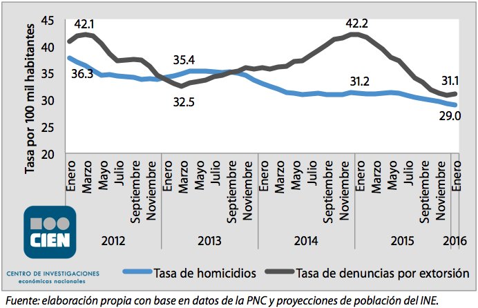Las tasas de homicidios y de extorsión se han reducido, aunque el comportamiento de la última ha sido más variable.pic.twitter.com/x4faT9TS9R