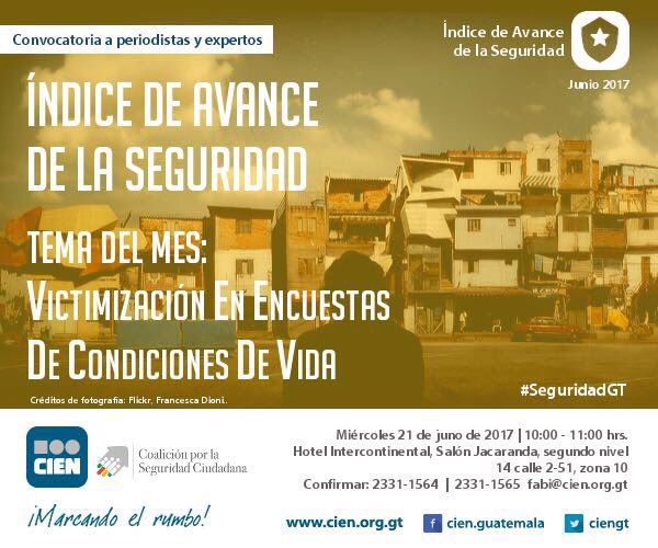 #SeguridadGT El miércoles 21 de junio presentando: Índice de seguridad con el tema de mes:victimización en encuestas de condiciones de vidapic.twitter.com/RxT5l2mSDL