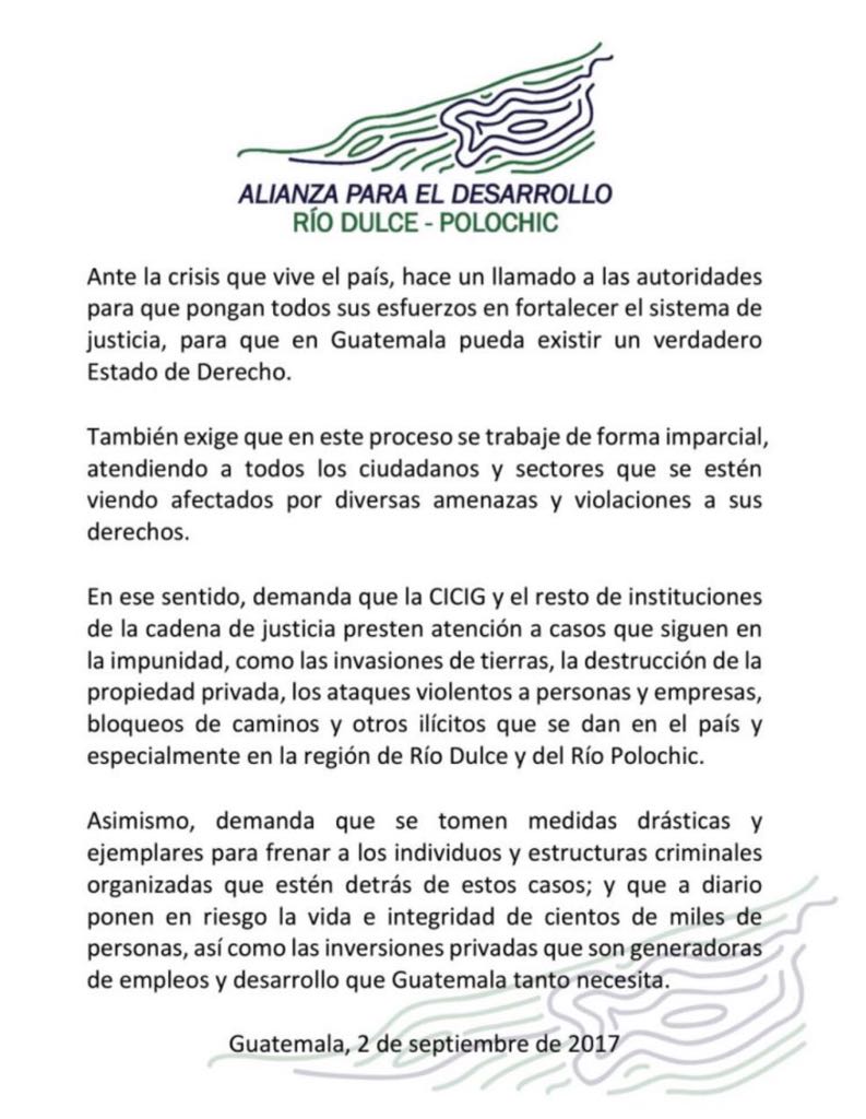 Alianza para el Desarrollo del Río Dulce Polochic se pronuncia:pic.twitter.com/p1gCgecykx