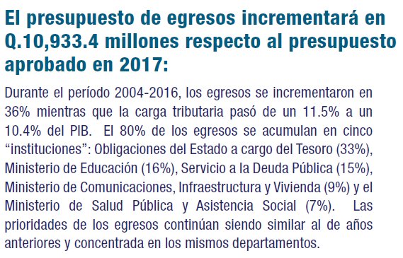 El Presupuesto de Egresos incrementará en Q10,933.4 millones respecto al presupuesto aprobado 2017.