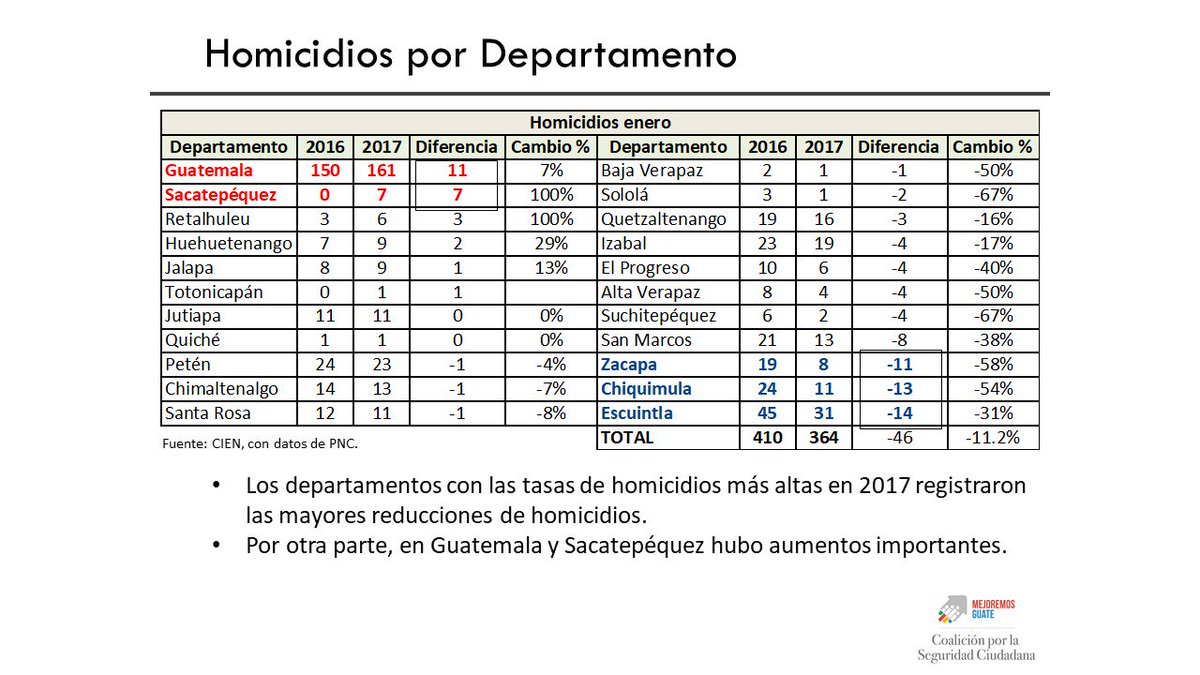 Donde hubo mayor homicidios el año pasado, en enero 2018 hubo una mayor reducción. Observe los departamentos resaltados en azul #SeguridadGT:pic.twitter.com/6mKfAN3q3c