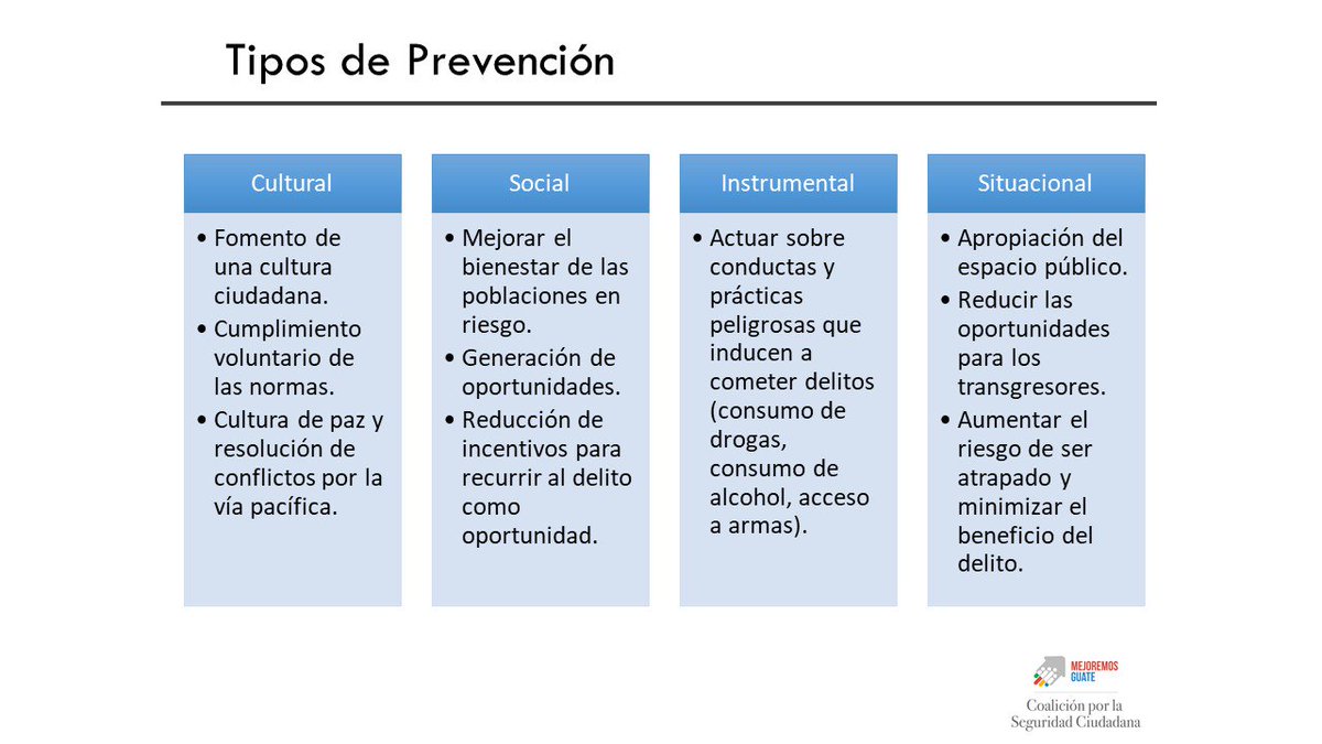 "Aparte de los niveles de prevención, hay tipos de prevención- cultural, social, instrumental y situacional" @walter_menchu respecto a #SeguridadGTpic.twitter.com/OFzkMF9RLj