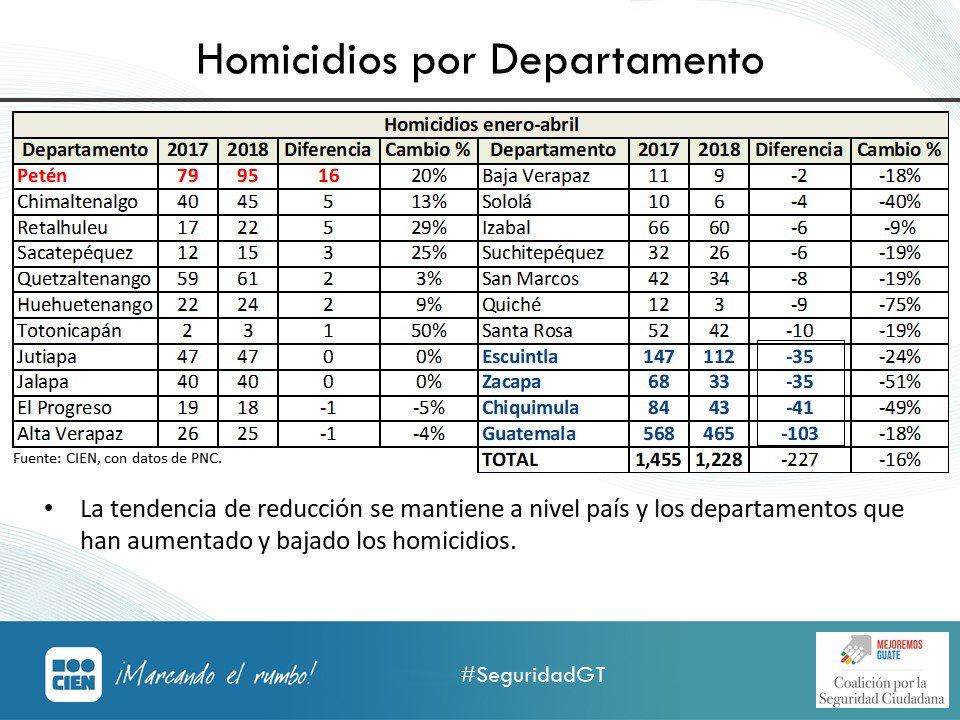 Los datos de #SeguridadGT registrados para abril 2018 en comparación con abril 2017 demuestran que en Escuintla, Zacapa, Chiquimula y Guatemala bajó la tasa de homicidios pero Petén continúa con una cantidad de homicidios alta que se incrementó en 20%pic.twitter.com/whLEcUaRA4