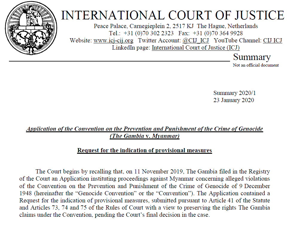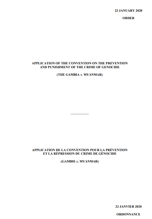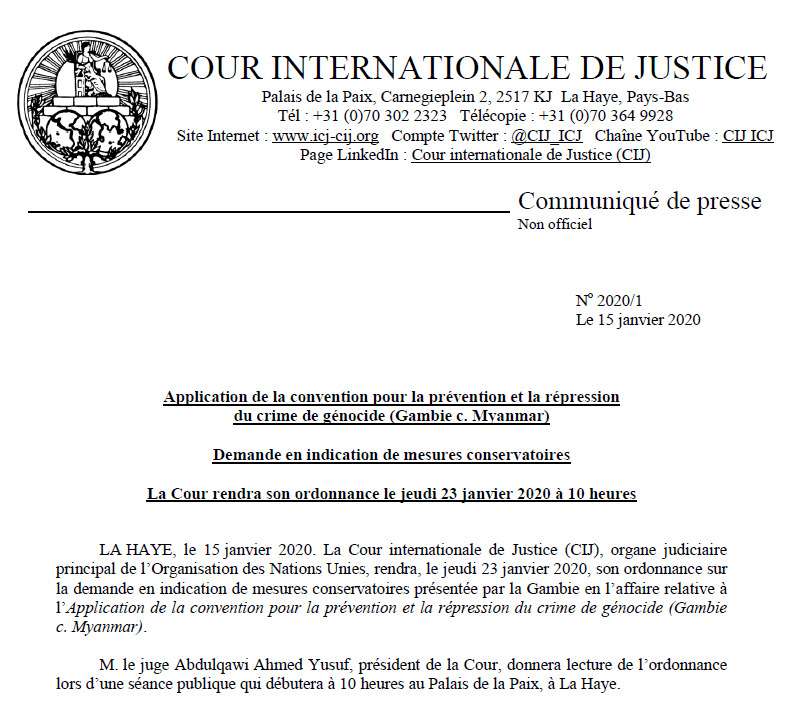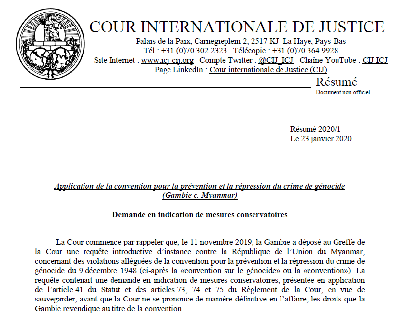 #CIJ sur la demande en indication de mesures conservatoires présentée par la Gambie dans l’affaire de l'Application de la convention pour la prévention et la répression du crime de génocide (#Gambie c.#Myanmar) https://bit.ly/2LNFC3W pic.twitter.com/tSmp8JGqyM