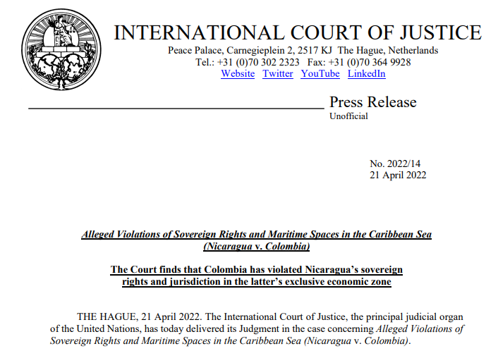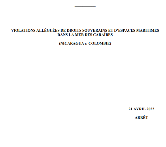 #ICJ Judgment in the case concerning the Alleged Violations of Sovereign Rights and Maritime Spaces in the Caribbean Sea (#Nicaragua v.#Colombia) are available here https://bit.ly/3EyIWdc pic.twitter.com/bWa56ux512