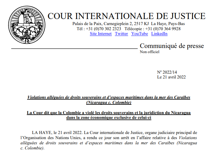 #CIJ en l’affaire relative à des Violations alléguées de droits souverains et d’espaces maritimes dans la mer des Caraïbes (#Nicaragua c.#Colombie) sont disponibles ici https://bit.ly/3EyIWdc pic.twitter.com/3JWQP4J8kz