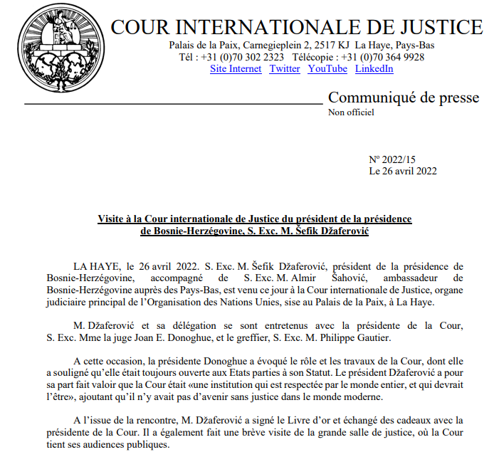 #BosniaandHerzegovina, today paid a visit to the#ICJ at its seat at the Peace Palace in The Hague https://bit.ly/3kkpqrz . Photos of the visit are available at https://bit.ly/3xTCxrL pic.twitter.com/q4G02GBlCy