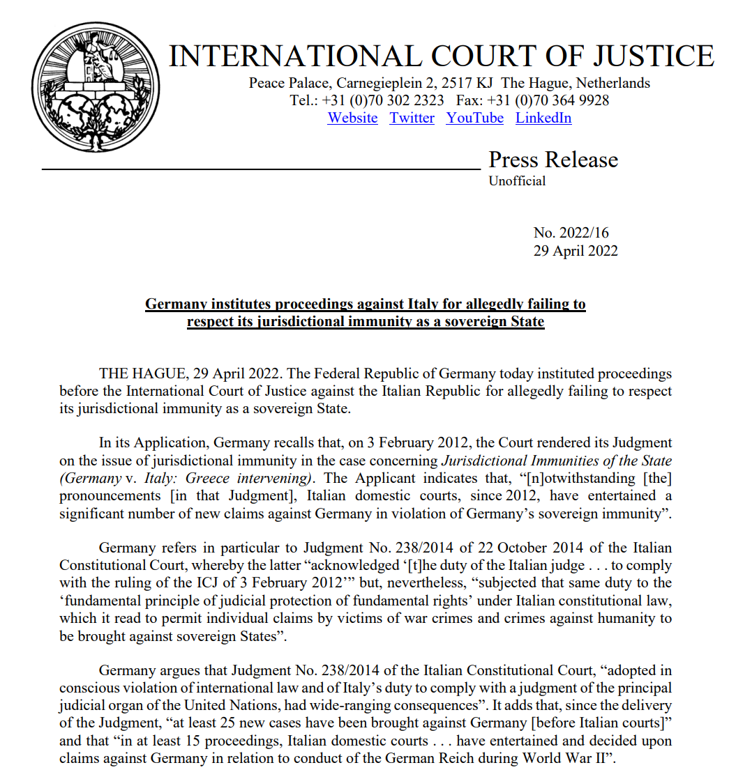 #Germany institutes proceedings against#Italy for allegedly failing to respect its jurisdictional immunity as a sovereign State and requests the#ICJ to indicate provisional measures https://bit.ly/3LwSzMo pic.twitter.com/4b3jis2rVK