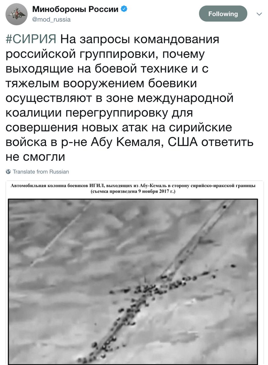 Three other images @mod_russia used to accuse US of cooperating with ISIS were also taken from an Iraqi Air Force video shot near Fallujah in 2016 http://www.military.com/video/operations-and-strategy/terrorism/iraqi-army-aviation-decimate-isis-convoys/5021631506001 …