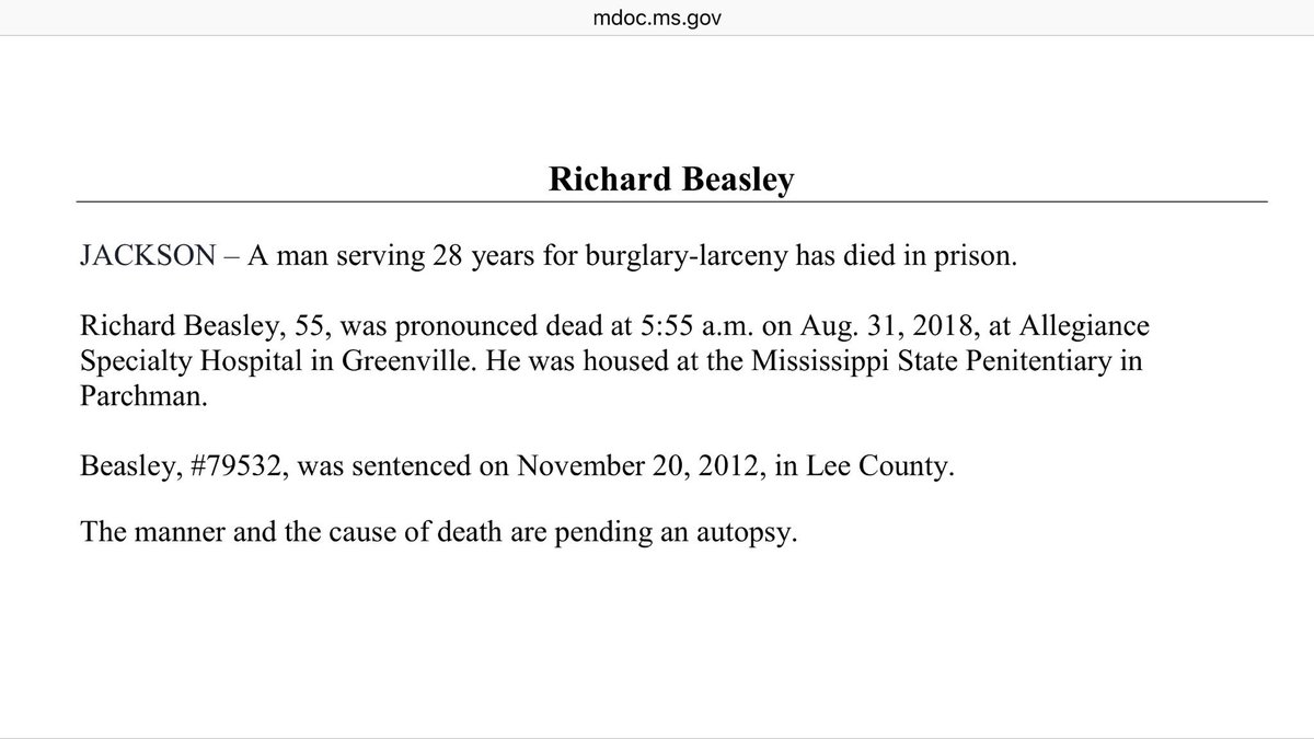 We now know 16 inmates died in MDOC facilities in August. Richard Beasley, 55, died Aug. 31 at a Greenville hospital. He had been housed at Parchman. MDOC posted this after 1 pm today in a section devoted to inmate deaths. Manner/cause of death pending autopsy.