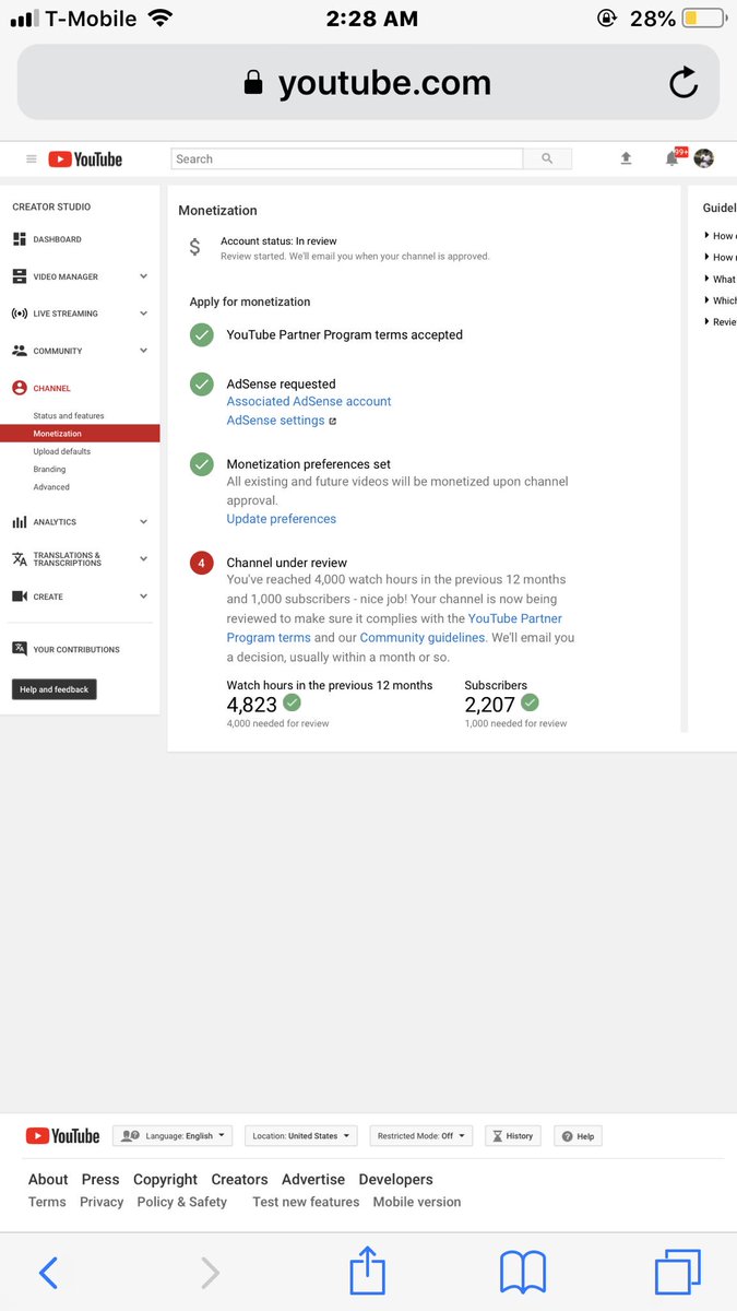Hi @TeamYouTube @YTCreators @YouTubeGaming So I hit 1,000 subscribers March 2nd, and reach 4,000 Watch hours April 29th. Now I’m waiting to get approval for monetization, Ive been waiting over 2 mouths, sorry to bother but can I get help ASAP... http://YouTube.com/c/CJSTAYFLY pic.twitter.com/axSa7C5VO9