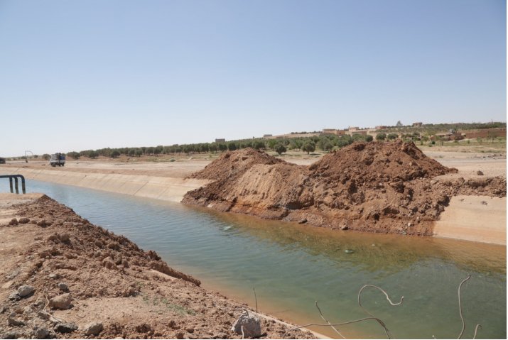 Water flows through the Adnanea Canal after a dirt bridge is removed in Adnanea,