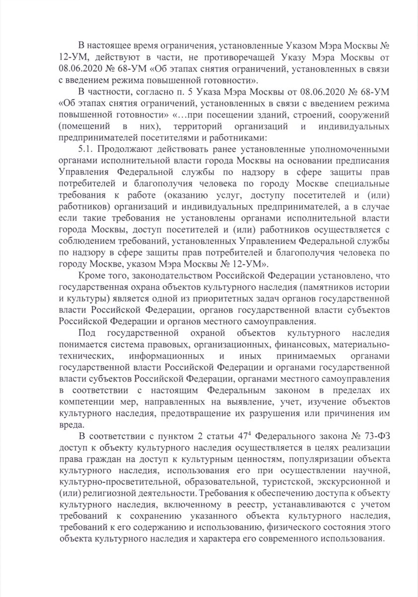 Хотя я писал официальные запросы в Мосгордуму, мне пока не отвечают. Но ответили Ярославу Шинкаренко. Ответ написан так, чтобы запутать нормального человека. «Техническими причинами» закрытия парка оказалась эпидемиологическая обстановка и защита культурного наследия! ЧТО?