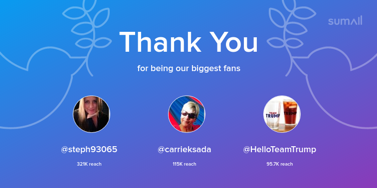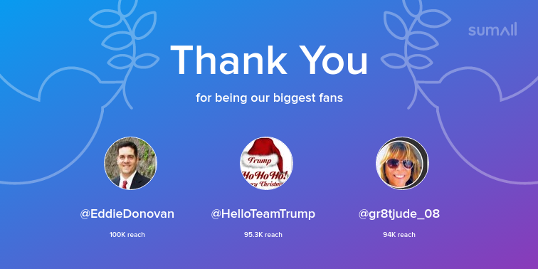 Our biggest fans this week: EddieDonovan, HelloTeamTrump, gr8tjude_08. Thank you! via https://sumall.com/thankyou?utm_source=twitter&utm_medium=publishing&utm_campaign=thank_you_tweet&utm_content=text_and_media&utm_term=0044566267e59358bf445aeb …pic.twitter.com/FQV85hA0Uh