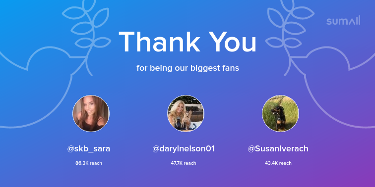 Our biggest fans this week: skb_sara, darylnelson01, SusanIverach. Thank you! via https://sumall.com/thankyou?utm_source=twitter&utm_medium=publishing&utm_campaign=thank_you_tweet&utm_content=text_and_media&utm_term=0044566267e59358bf445aeb …pic.twitter.com/1e8CcW8FO7