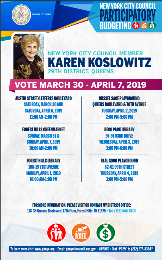 Participatory Budgeting is back in District 29! Vote on how you would spend $1 Million! Meet us at any of our voting locations through the week or vote online at http://pbnyc.org/vote Vote tomorrow at the intersection of Austin Street & Lefferts Blvd. from 11AM to 1PMpic.twitter.com/ginuWVYxdT