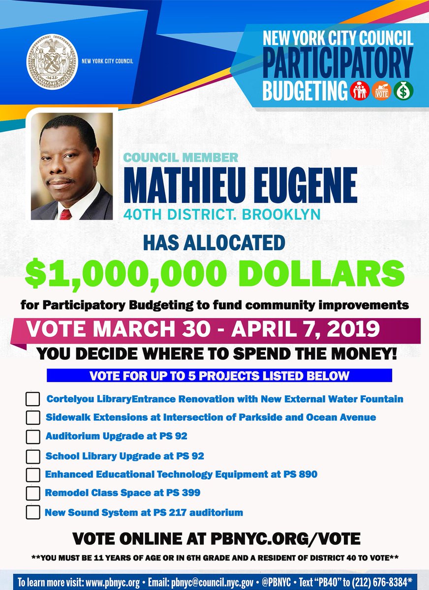 @PBProject. Please vote online at http://pbnyc.org/vote to decide where@CMMathieuEugene will allocate $1M dollars in the 40th District.#PBNYCpic.twitter.com/XbV9Gc1ees