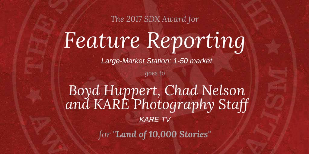#SDXAward for Feature Reporting (Large-Market Station: 1-50 market) goes to@BoydHuppert,@CMNelsonPhoto and KARE Photography Staff,@kare11, for Land of 10,000 Stories.pic.twitter.com/Y2eYb05cvq