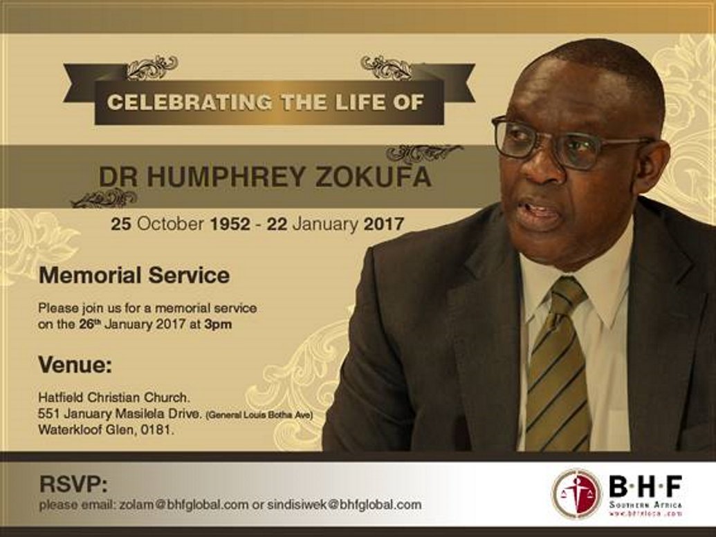 Memorial service of Dr Humphrey Zokufa on the 26 Jan 2017 at 3pm at Hatfield Christian Church.pic.twitter.com/gX3AamrqKy