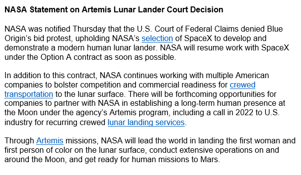 NASA statement: "There will be forthcoming opportunities for companies to partner with NASA in establishing a long-term human presence at the Moon under the agency’s Artemis program" https://www.cnbc.com/2021/11/04/bezos-blue-origin-loses-lawsuit-against-nasa-over-spacex-lunar-lander.html …pic.twitter.com/n1tIYpLKw8