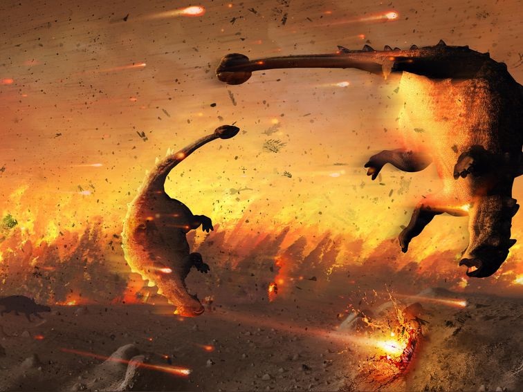 This is a 100% scientifically accurate artist's rendering of the extinction of the dinosaurs and I never considered how funny it is to think of multi-ton reptilian beasts being ragdolled around like the fucking feather from Forrest Gump.