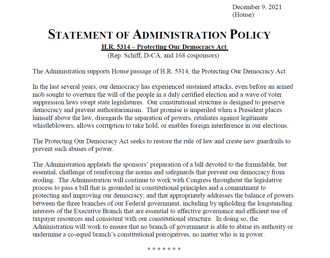 Really great to see this. "The Administration supports House passage of H.R. 5314, the Protecting Our Democracy Act." STATEMENT OF ADMINISTRATION POLICY The