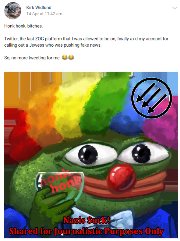 All of Kirk's social media accounts are banned, besides VK, which allows hate speech, likely for what's seen above. Here he is lamenting his banning. ZOG stands for "Zionist Occupation Government" and is an anit-semitic conspiracy theory pushed by the KKK and other WN groups.pic.twitter.com/x6XWzZjPwE