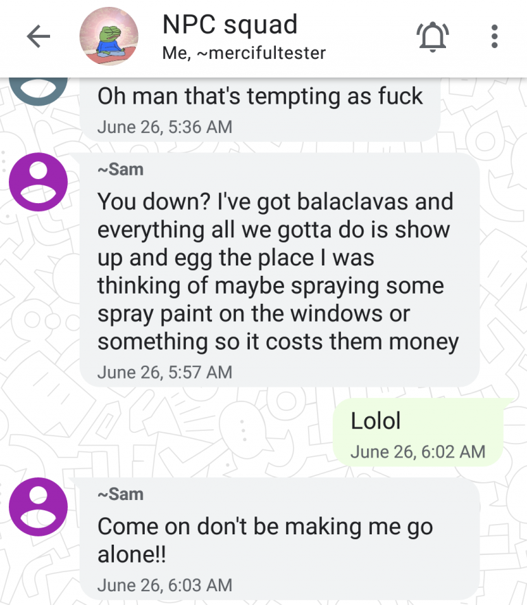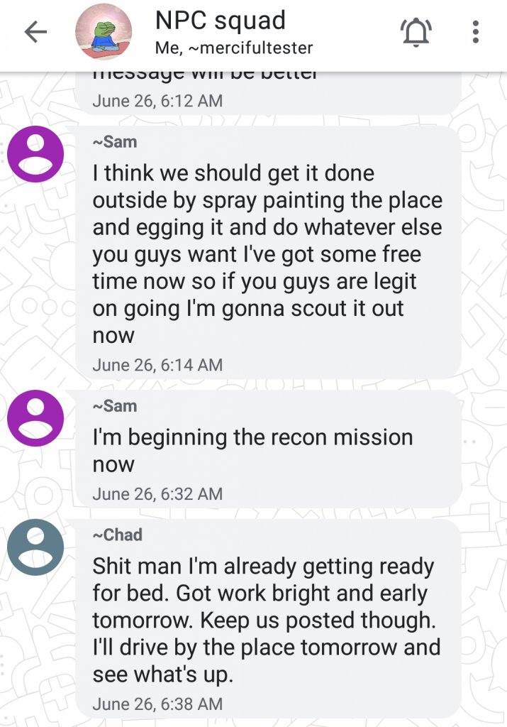The attack on Hope Tank's Drag Queen Story Hour was coordinated in this very chat with Chad Kovacs. Notice that Chad said he would have joined Sam if he didn't have work. Read our report on Samuel Cordova here: https://cospringsantifa.noblogs.org/post/2019/07/03/patriot-front-member-and-lifestyle-anarchist-samuel-cordova-co/ …pic.twitter.com/PxGx2eqK1n