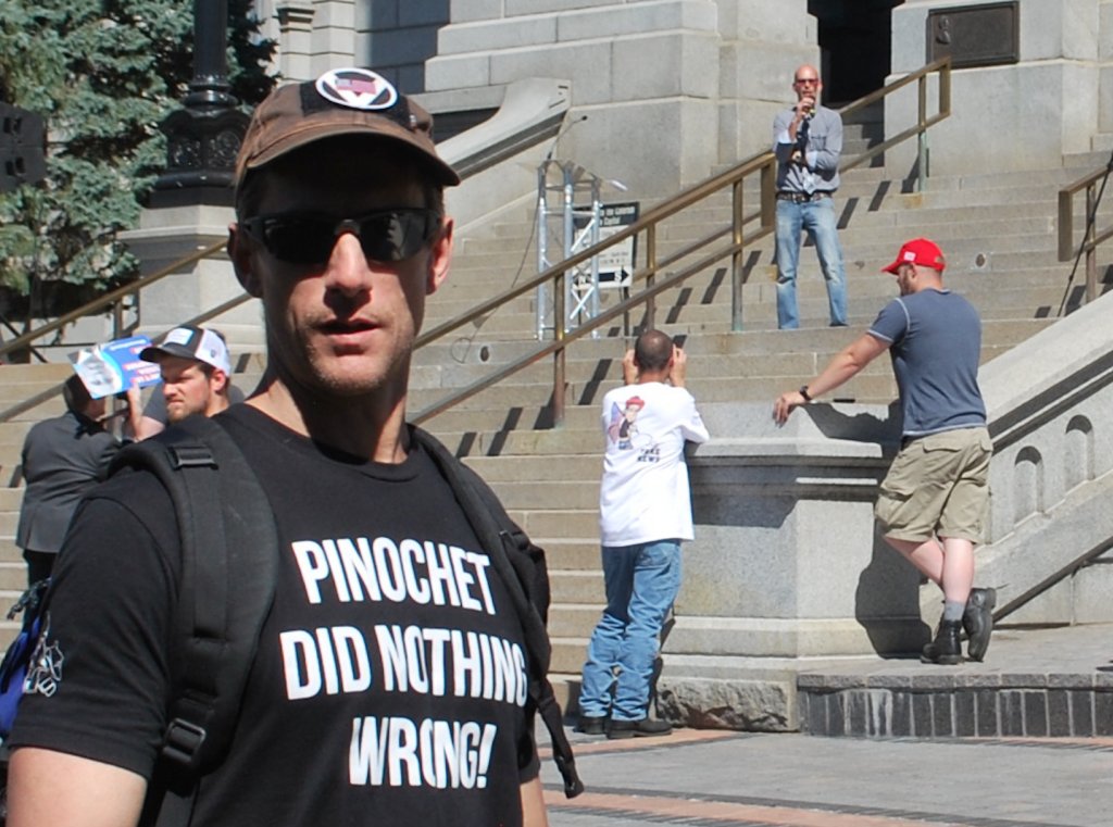 The Walker Stapleton Super PAC recruited at a fascist rally organized by a CO GOP State Rep in Denver whose key speaker was Proud Boy Louie Huey. Pic - Stapleton canvasser at the rally next to a "Right Wing Death Squads" shirt & Charlottesville participant Shane Reevespic.twitter.com/iMb0EOQX9S