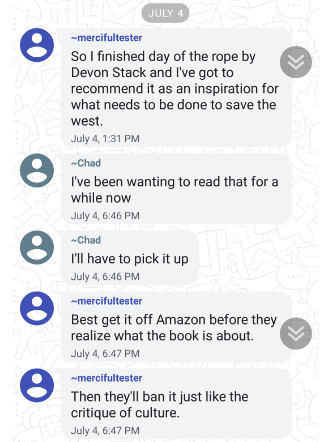 Here's Chad and an un-ID'd member of the chat talking about the book Day Of The Rope, a white supremacist novel about a violent white supremacist revolution. They are also upset that holocaust denial is frowned up.pic.twitter.com/ndVZXIj57E