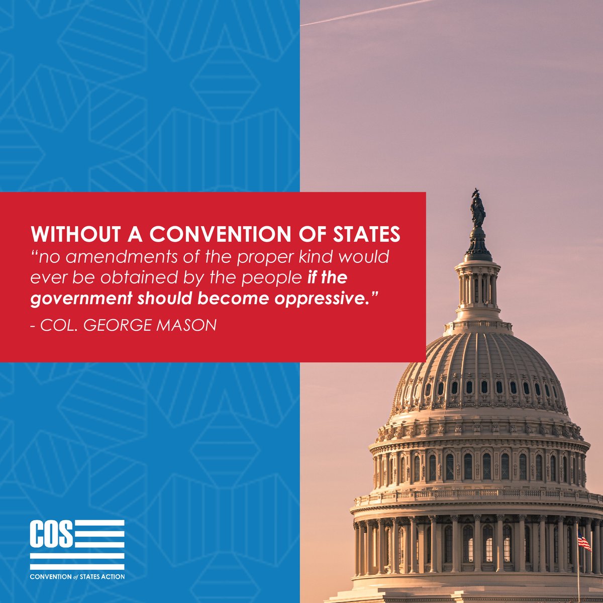 Col. George Mason knew that Congress would never propose amendments to limit its own power! That’s why he pushed to include the Convention of States option in Article V, and that’s why the framers voted unanimously to include it. http://www.conventionofstates.com pic.twitter.com/DLlCerCkOG