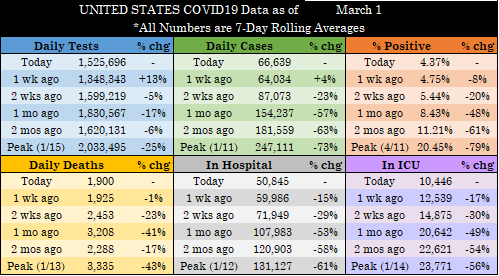 (tests, cases, deaths, hospitalizations, ICU, and % testing positive as of Today, 1 week, 2 weeks, 1 month, and 2 months ago—data from @COVID19Tracking)