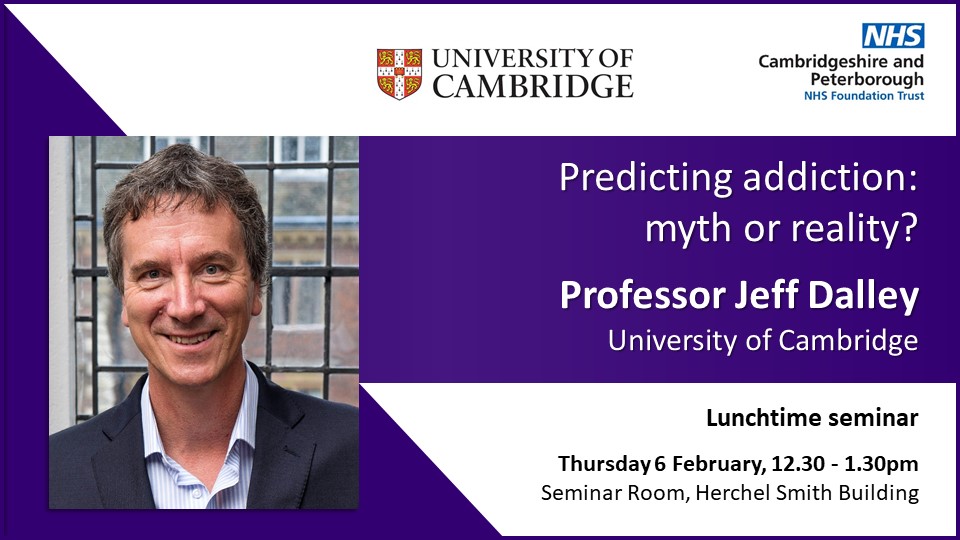 #addiction: Join Professor Jeff Dalley from@psychiatry_ucam@CambPsych on Thursday to unpack the latest research on predicting addiction, and find out how we can improve care for people battling it. Come to the Herchel Smith Building @ 12.30pm: http://bit.ly/2XhSodO pic.twitter.com/aAEgxRw1qS