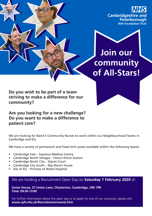 We are hosting a Recruitment Open Day for our Neighbourhood nursing teams! If you are interested or would like to find out more then please come down to our Recruitment Open Day on 1st Februrary!