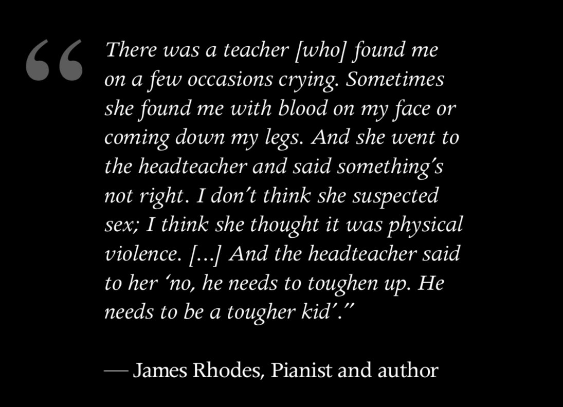 Among sex abuse survivors "are male survivors too, who face a different stigma, but which is equally grounded in a patriarchy that, precisely because we’re male, doesn’t permit us to be victims or survivors.” Extract from What Lies Beneath http://home.crin.org/s/What-Lies-Beneath-Silence.pdf …