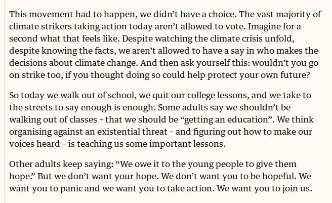 Children on strike today absolutely hitting the nail on the head. If children are denied the vote, we should expect them to protest. Especially when adults have failed to take action. https://www.theguardian.com/commentisfree/2019/mar/15/school-climate-strike-greta-thunberg … #FridaysForFuture #ClimateCrisis #schoolstrike4climatepic.twitter.com/64Qm7bJe1k