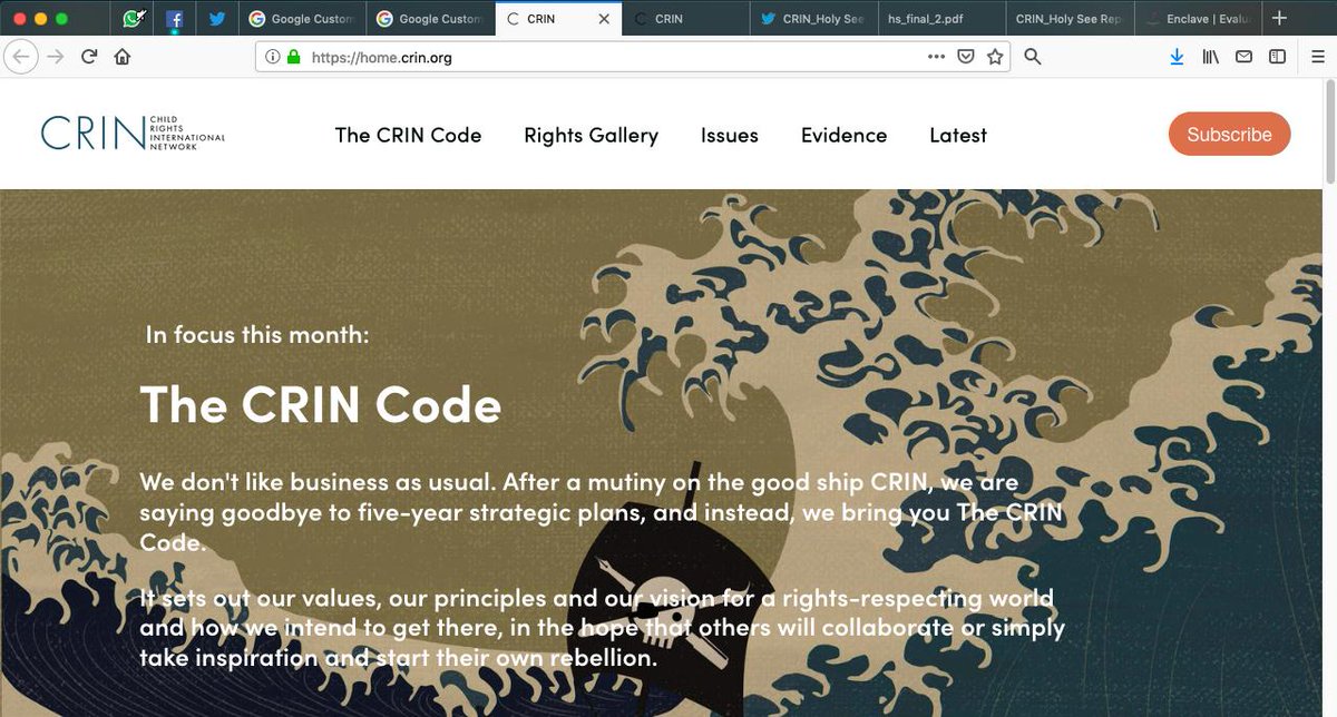 Mientras tanto, aquí están las páginas que le interesan: - campaña para poner fin a la violencia sexual en las instituciones religiosas https://archive.crin.org/es/paginal-principal/campanas/pongamos-fin-la-violencia-sexual-en-las-instituciones-religiosas.html … - página del informe mundial (https://archive.crin.org/es/biblioteca/publicaciones/santa-sede-el-abuso-sexual-de-ninos-informe.html …) y el PDF del informe (https://archive.crin.org/sites/default/files/holy_see_report_final_spanish.pdf …)