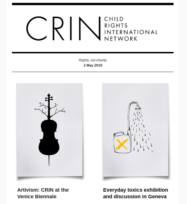 In case you missed it, the latest news from us: CRIN at the Venice Biennale and an everyday toxics exhibition and discussion in Geneva. https://mailchi.mp/096b664a48b4/the-latest-from-us-1883905?e=6d851f4924 … #Art #HumanRights #ChildRightspic.twitter.com/AwwmI0EG9R