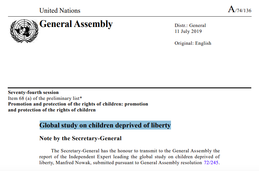 Children globally are locked up in prisons, immigration detention centres, care institutions, drug treatment centres and mental health facilities. The #GSCDL report calls out the deprivation of children's liberty as a rights violation https://undocs.org/A/74/136