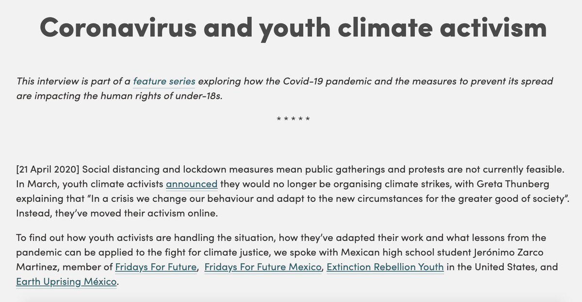 How has #Covid_19 changed youth climate activism & what lessons from the pandemic could apply to the fight for climate justice? We spoke with 16y/o Mexican activist @JeronimoZarco to find out. Interview https://home.crin.org/latest-coronavirus-and-youth-climate-activism … #ClimateStrikeOnline #DigitalClimateStrikepic.twitter.com/1J0n8JDo4K